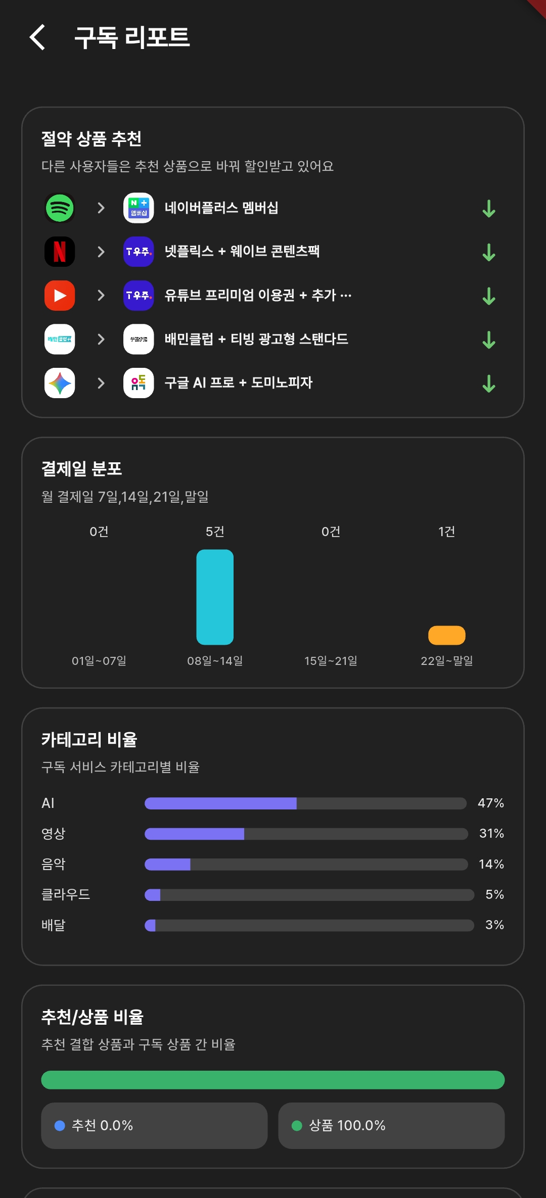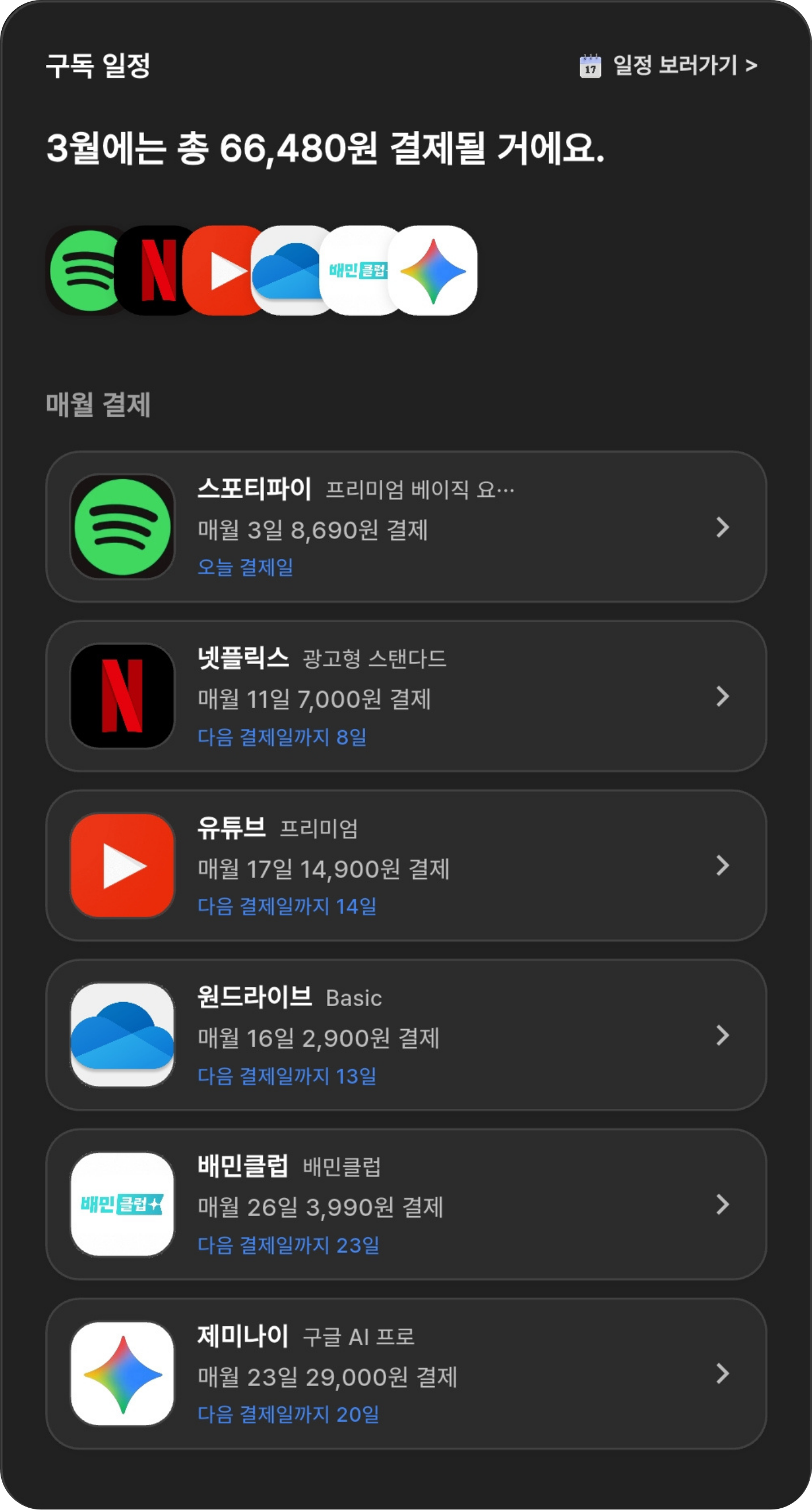 이용 중인 구독을 한 곳에서 정리하고,결제 흐름을 쉽게 파악하세요.